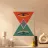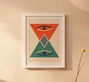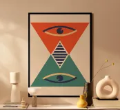 A visually symbolic abstract poster that uses geometric forms to create an hourglass shape, suggesting themes of time and duality. The design features a large, inverted triangle of coral red at the top and a large triangle of deep teal at the bottom, meeting at a central striped diamond motif. Embedded within each large triangle is a stylized eye shape with a segmented pupil, in navy and pale yellow, giving the piece a surreal and figurative element. This artwork blends the geometric precision of the Bauhaus with subtle symbolism. This high-resolution digital download (7000x5000 pixels, 300 dp