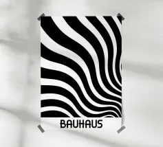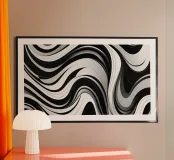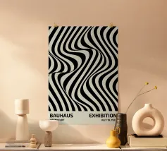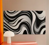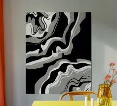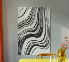 The composition features flowing black and white patterns with soft curves that evoke a sense of rhythm and fluidity, enhancing the visual experience with its dynamic appeal.