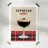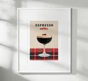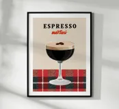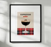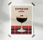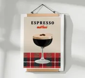 A rich espresso martini fills a rounded coupe glass, topped with a velvety crema and two coffee beans, resting on a bold red tartan tablecloth against a warm beige background. This cozy cocktail print brings intimate café-bar vibes and a touch of winter warmth to any kitchen, dining room or home bar.