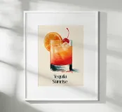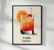 A vibrant illustration of a Tequila Sunrise served in a low glass, with glowing layers of orange and red, sparkling ice cubes, a juicy orange slice and a bright red cherry. The soft cream background and watercolor splashes give it a warm, relaxed summer vibe, perfect for a kitchen, bar corner or dining room.