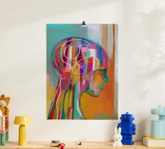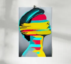A black silhouette stands motionless while its head dissolves into a flowing spectrum of red, blue, yellow and white. The colours flow like thoughts or emotions, dissolving and dripping down as if they are lost in their surroundings. The flowing transitions between the colours create a dynamic, almost meditative effect that hovers between chaos and harmony. An expression of identity, creativity and the fragility of the spirit.