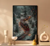 Model steam train in winter forest with bokeh lights hahnemühle