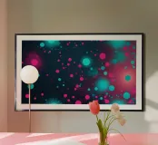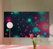 Colorful circles in shades of blue and pink scatter across a dark background, creating a lively abstract design perfect for enhancing desktop aesthetics and artistic expressions.