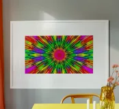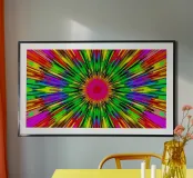 A captivating artwork features a central radial burst of vivid colors including pink, green, and purple. This abstract design creates a striking visual experience suitable for various artistic uses.