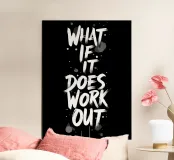 This striking digital art features the powerful and optimistic phrase "WHAT IF IT DOES WORK OUT" rendered in bold, textured white lettering against a stark black background. The brushstroke style gives the text a dynamic and hand-painted feel, while scattered white dots and subtle grey ink splatters add depth and visual interest. This piece serves as an inspirational reminder to embrace hope and consider positive outcomes.