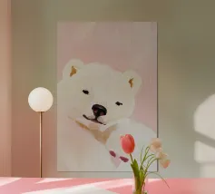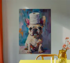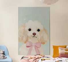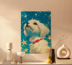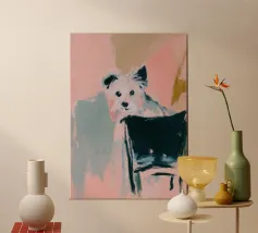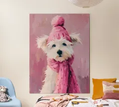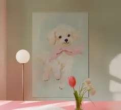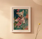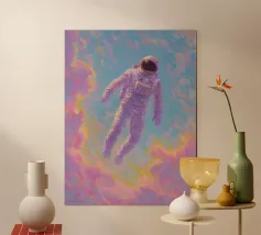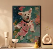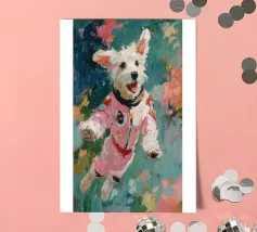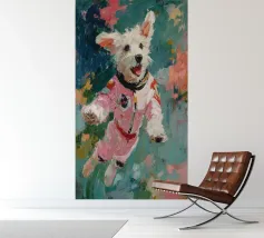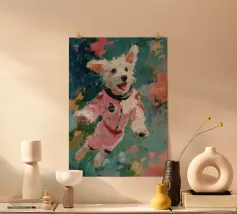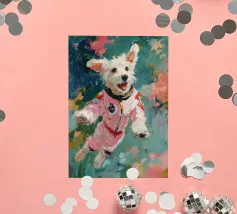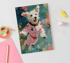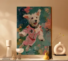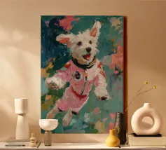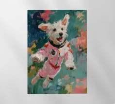 Oil painting of a white dog in a pink spacesuit flying through space. Impressionistic style with playful, romantic elements, vivid colours, pastel background and bold brushstrokes and palette-knife strokes for a dreamlike, cute scene.