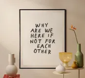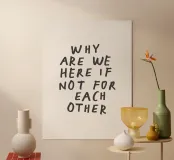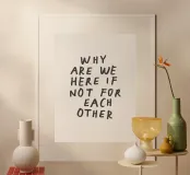 Bring warmth and connection to your space with this art print featuring the heartfelt phrase “Why Are We Here if Not for Each Other” in charmingly crude, innocent hand lettering. Set against a soft beige background, this piece celebrates kindness, togetherness, and the beauty of imperfection. Perfect for gifting or adding a thoughtful touch to your home, this print suits living rooms, bedrooms, and creative spaces. A gentle reminder of empathy and unity, it’s ideal for birthdays, anniversaries, or simply to uplift loved ones.