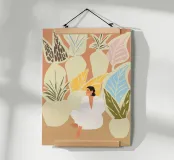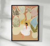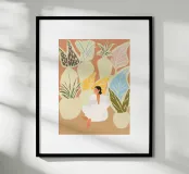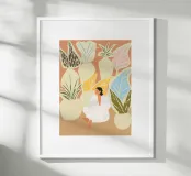 This motif exudes perfect Mediterranean lightness - a woman in white sits relaxed in front of oversized plants, reminiscent of ceramic vases in a pastel colour palette. The style is modern-naïve, inspired by the cut-outs of the late Henri Matisse and contemporary illustration art in a trendy boho style. The two-dimensional composition dispenses with depth but creates a soothing calm. Ideal for rooms that need to radiate serenity and gentle elegance.