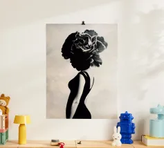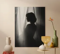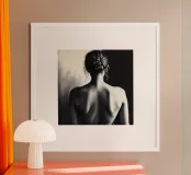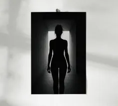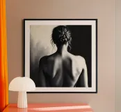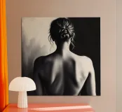 A woman poses with her back turned, showcasing the contours of her spine and shoulder blades. The black and white tones enhance the beauty of her silhouette and create an artistic atmosphere.