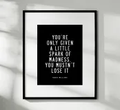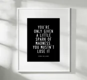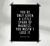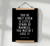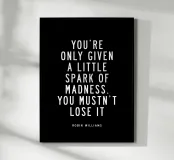 Elevate your space with this striking typography art print featuring Robin Williams' iconic words. The powerful phrase "You Are Only Given a Little Spark of Madness You Must Not Lose It" is elegantly rendered in crisp white modern sans-serif lettering against a deep black background. This high-contrast design creates a bold visual impact, perfect for home offices, living rooms, or creative spaces. A daily reminder to embrace your unique spark, this print inspires creativity and individuality. Ideal for fans of Robin Williams, comedy enthusiasts, or anyone seeking a touch of wit and wisdom!
