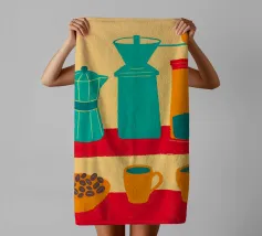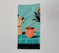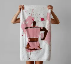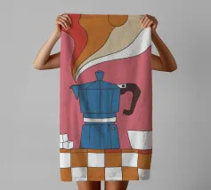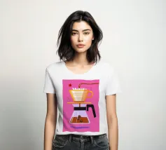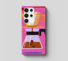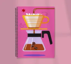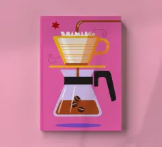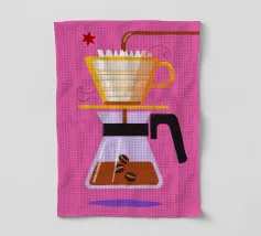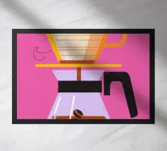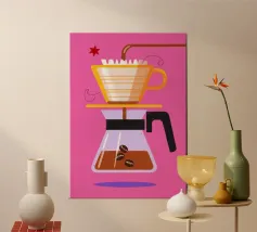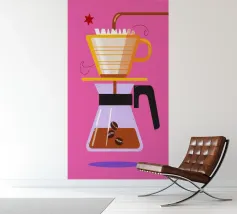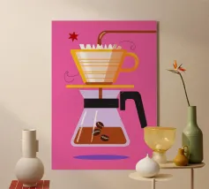 A graphic illustration of a pour over coffee maker in action, set against a bold pink background. The modern, stylized depiction is a perfect tribute to the art and ritual of specialty coffee.