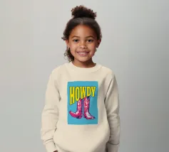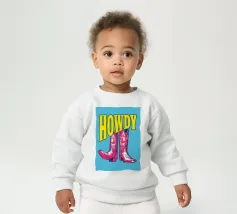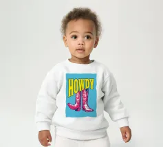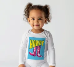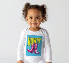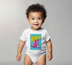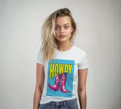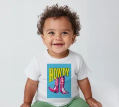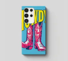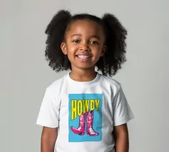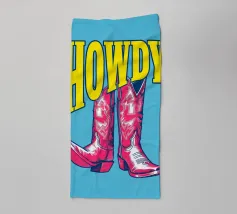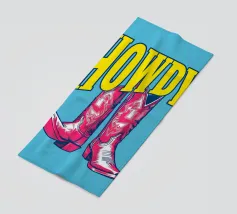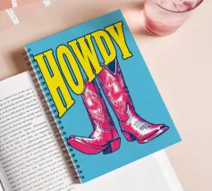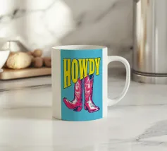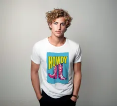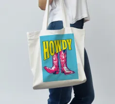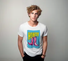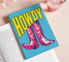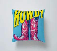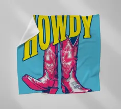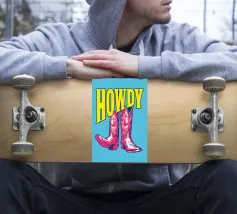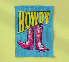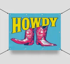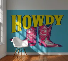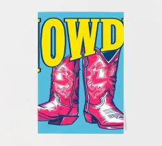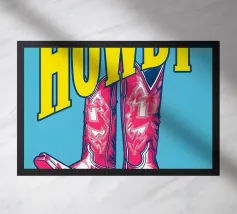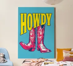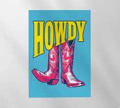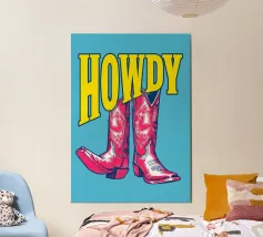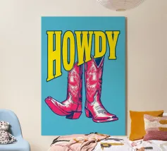 Step into the wild west with a vibrant pop art twist with this "Howdy" cowboy boot print. This captivating artwork features a pair of stylized red cowboy boots, rendered with intricate white details and a slightly distressed, hand-drawn look, standing boldly against a bright blue background. Above them, the word "HOWDY" is emblazoned in large, impactful yellow lettering, echoing a classic Western greeting. This piece is perfect for adding a touch of playful Americana, retro charm, and bold color to any space, appealing to both country enthusiasts and pop art lovers. Crafted with exceptional di