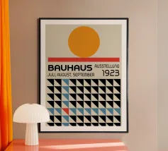This graphically clear, abstract Bauhaus motif shows a rhythmic triangle and square pattern in strong red on a warm cream background. The strictly geometric arrangement creates an exciting balance of dynamism and order and is reminiscent of classic Bauhaus and mid-century design principles. Through the deliberate use of contrast and repetition, the pattern appears modern, timeless and architectural at the same time. The reduced colour palette lends the design calm and strength without losing expression. Ideal as a wall mural for living rooms, design posters, modern wall art.