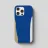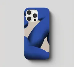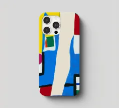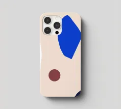 Several distinct shapes and colors dominate the composition, offering a minimalist and abstract aesthetic. A bold blue shape is juxtaposed with a tan form on the left and a white elongated form on the right.