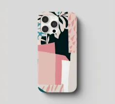 A modern, abstract composition featuring a patchwork of various patterns and shapes. Elements include organic leaf like forms, geometric grids, and abstract textures in a muted palette of pink, black, and beige, reflecting a bohemian, eclectic style.
