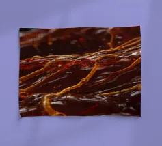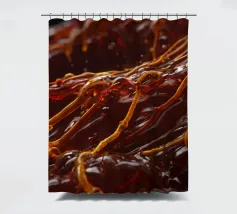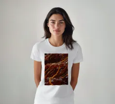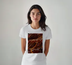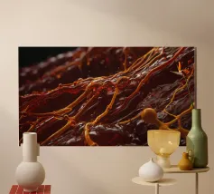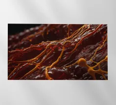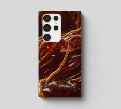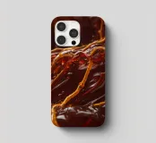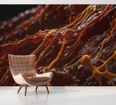 A mesmerizing display of fluid dynamics where orange and red liquid layers swirl and intertwine across a textured surface, creating an intricate visual.