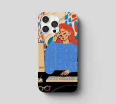 A contemporary illustration of a woman with vibrant red hair working at her computer in a dimly lit room. The glow from the screen illuminates her face and blue shirt. The scene captures a moment of focus and late night productivity, with personal items like glasses on the desk.