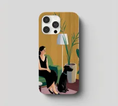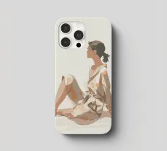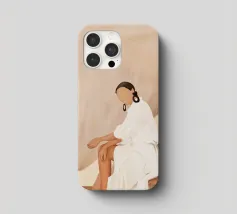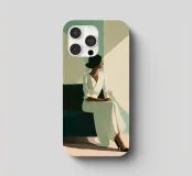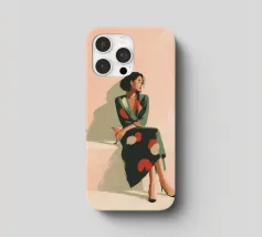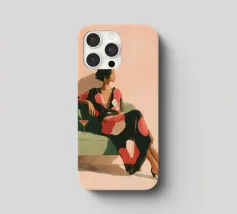 Blending mid-century tones and modern grace, this piece explores the intersection of shape and solitude. The soft color palette and bold geometry echo the woman’s tranquil presence, crafting a composition that feels like visual jazz—sophisticated and effortless.