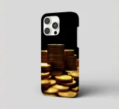 Piles of shiny coins are arranged in varying heights, surrounded by scattered coins, all illuminated against a black background, creating an eye-catching contrast.
