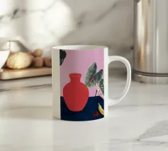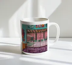 An interior setting features warm pink walls, a wooden cabinet displaying decorative items, an eclectic gallery wall, and a view into an adjoining room.