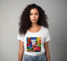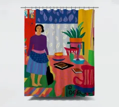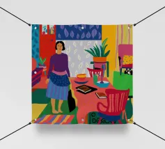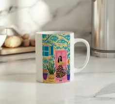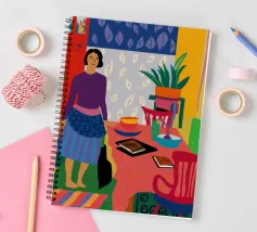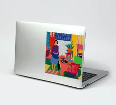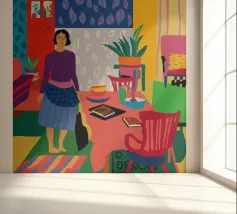A woman is captured in her creative element, sitting at a desk with a laptop in a cozy, colorful room filled with personal touches, embodying the spirit of a modern creator at home.