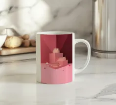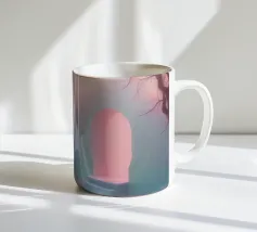 A serene space adorned with soft pink walls and large windows allowing gentle sunlight to stream in, creating delicate shadows on the floor. A fluffy texture enhances the tranquil ambiance.