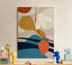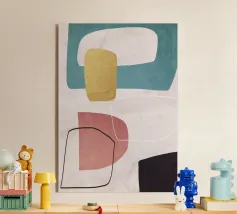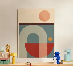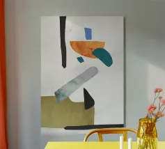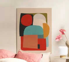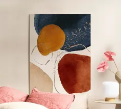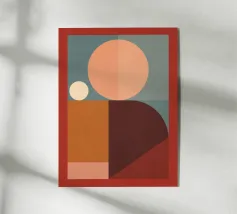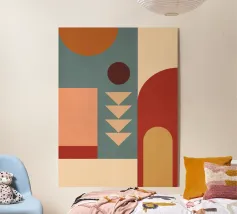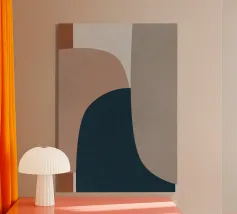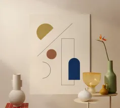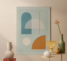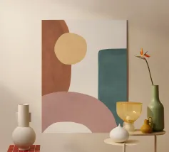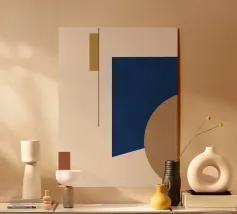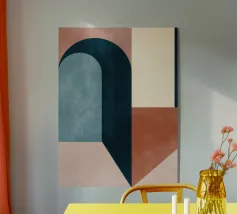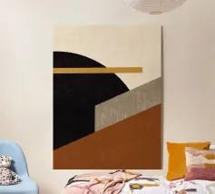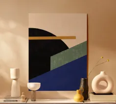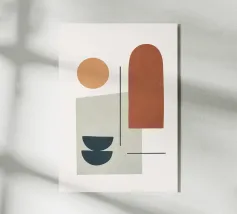 Geometric shapes and earthy tones create a modern design with abstract lines and forms. The composition includes overlapping rectangles and a semi-circle, highlighted by gold accents.