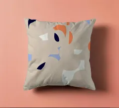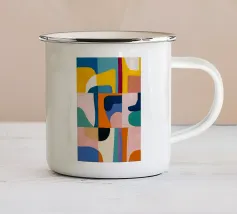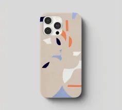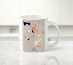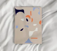 Abstract shapes and forms are arranged on a pale background, creating a composition that suggests a fragmented facial profile. Vivid colors such as blue, orange, and black are used for the geometric elements, contrasting with the subtle backdrop.