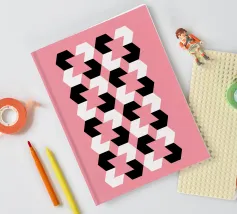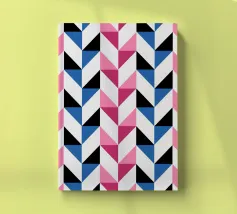 Geometric patterns repeat in a symmetrical design, featuring triangles and rectangles in black, yellow, and pink. The structured arrangement creates a visually striking and orderly composition.