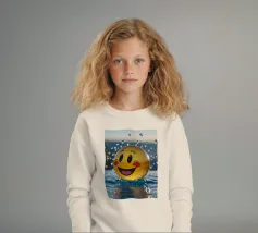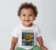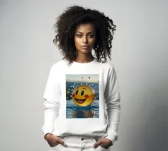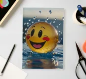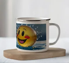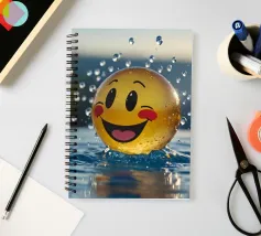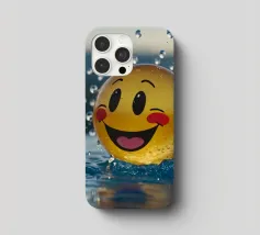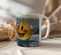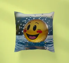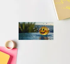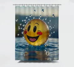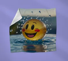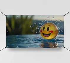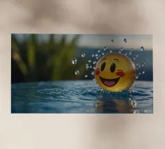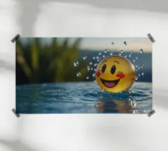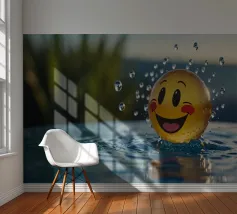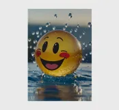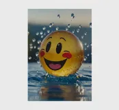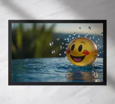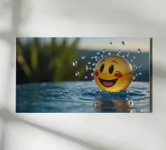 A bright yellow ball with a smiling face joyfully splashes in a calm pool, droplets sparkling in the sunlight, framed by lush green plants in the background.