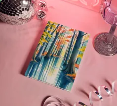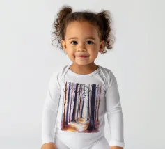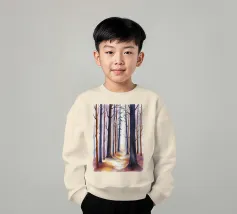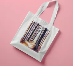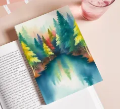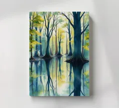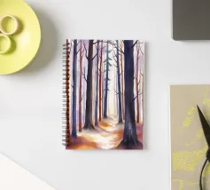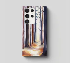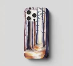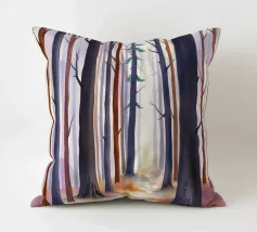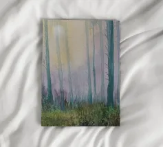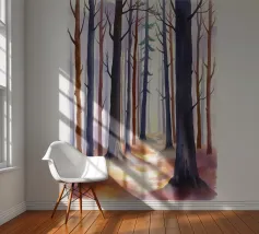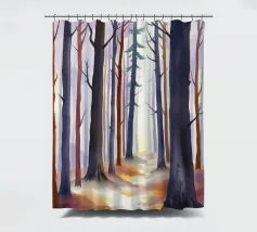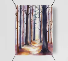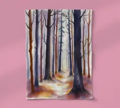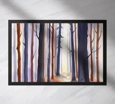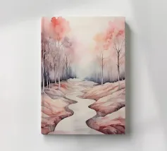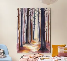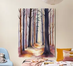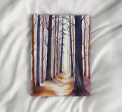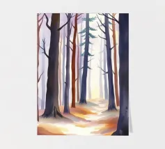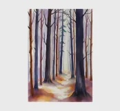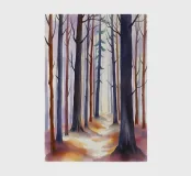 Step into the serene beauty of the "Enchanted Forest Pathway," a captivating watercolor landscape that invites you on a tranquil journey. This evocative artwork features a collection of towering trees, their slender trunks painted in a harmonious palette of warm browns, deep purples, and subtle greys, reaching skyward. A winding path, bathed in ethereal, shimmering light, leads the eye deeper into the mystical woods, creating a sense of wonder and peaceful introspection. The gentle glow suggests a hidden clearing or a new beginning, making this piece perfect for bringing a calm and inspiring a