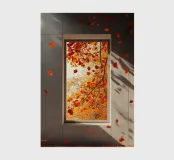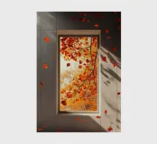 A moment suspended in time: a window framed in stone, autumn leaves drifting gently indoors, and sunlight tracing delicate shadows across the wall. “Autumn Window” is both minimalist and immersive, balancing the warmth of seasonal color with the quiet rhythm of falling leaves.