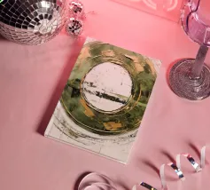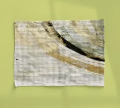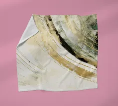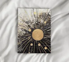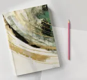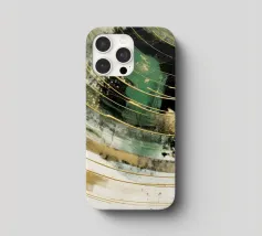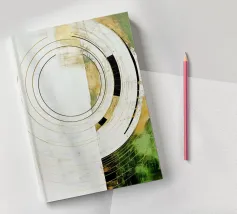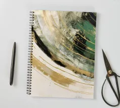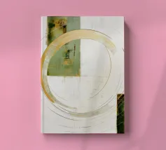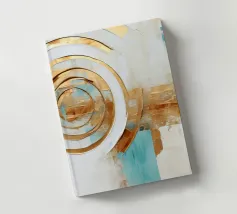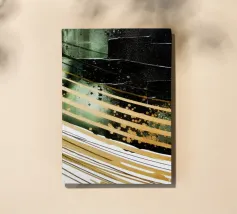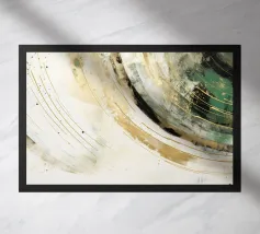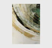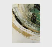 This artwork is an abstract composition in panoramic format, characterised by a dynamic mix of textures, colours and geometric shapes. Concentric golden circles create a sense of movement and depth. The texture is rich, with visible brushstrokes and layers of colour that create a special atmosphere. The interplay of green and earth tones with metallic accents gives the work a harmonious yet vibrant energy.