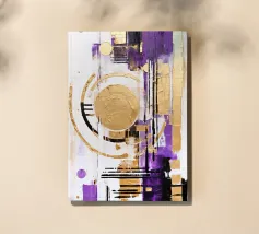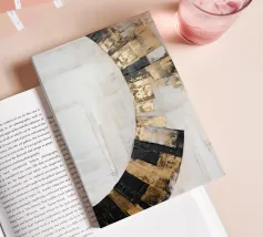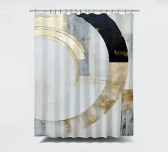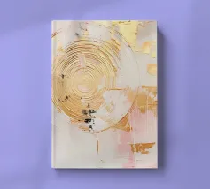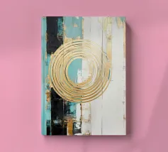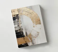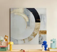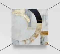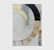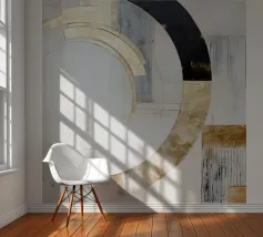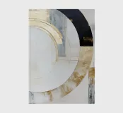 Modern art with gold-coloured shapes, muted contrasts and a texture in light grey tones. This abstract painting radiates a timeless, contemplative calm. The colours merge into a harmonious composition.