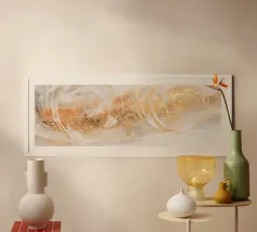 This artwork is an abstract composition in panoramic format, characterised by a dynamic mix of textures, colours and geometric shapes. Concentric golden circles create a sense of movement and depth. The texture is rich, with visible brushstrokes and layers of colour that create a special atmosphere. The interplay of green and earth tones with metallic accents gives the work a harmonious yet vibrant energy.