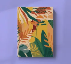 A modern abstract composition of various stylized botanical shapes and leaves in a palette of terracotta, beige, and dark blue against a light background.