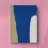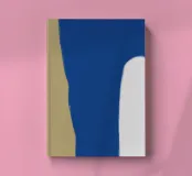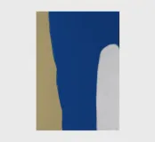 Several distinct shapes and colors dominate the composition, offering a minimalist and abstract aesthetic. A bold blue shape is juxtaposed with a tan form on the left and a white elongated form on the right.