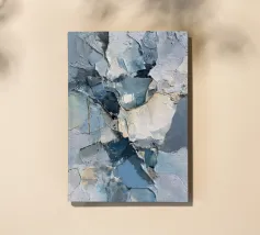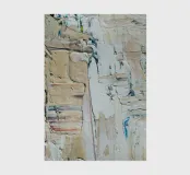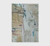 Thick layers of paint in earthy tones create a textured surface with hints of blue and red. The abstract composition evokes a sense of movement and depth.