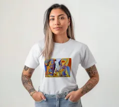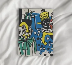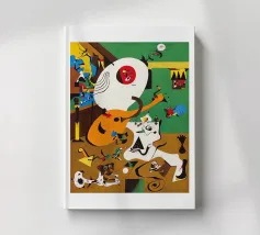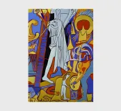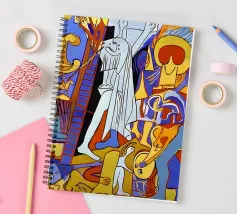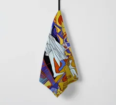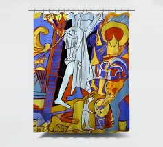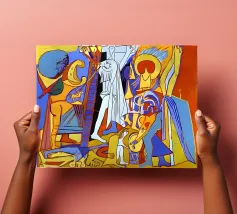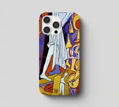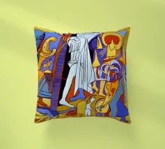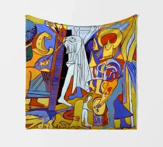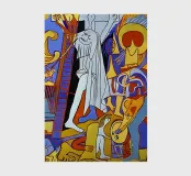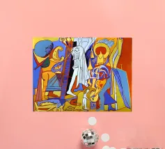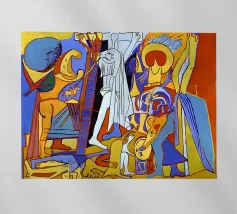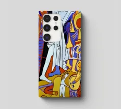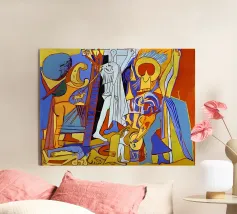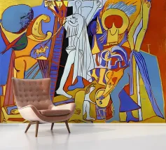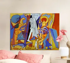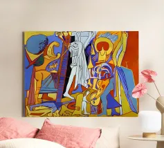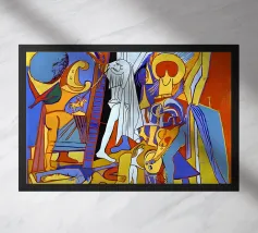 This vibrant and complex abstract painting showcases a dynamic Cubist composition with fragmented human figures and architectural elements. Rendered in a bold palette of blues, yellows, oranges, and purples, the artwork features interlocking shapes, distorted perspectives, and expressive lines, creating a sense of chaotic energy and emotional depth. The intricate details and contrasting colors invite the viewer to explore the multifaceted narrative within the piece. This high-quality digital poster (7000x5000 pixels, 300 dpi) magnificently captures the intellectual depth and artistic genius of