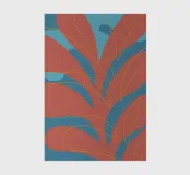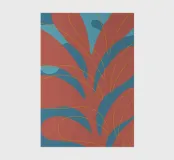 Abstract design featuring large, curvilinear red shapes superimposed on a blue background, intersected by thin, flowing yellow lines. The composition creates a sense of motion and organic patterns.