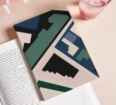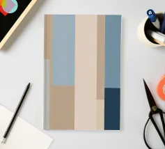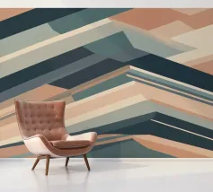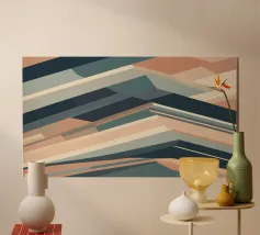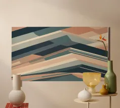 Vibrant abstract artwork showcases layered geometric shapes in shades of beige, blue, and gray, creating a dynamic and modern visual experience.