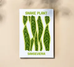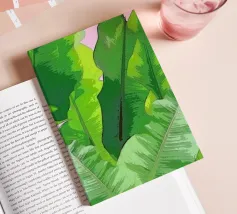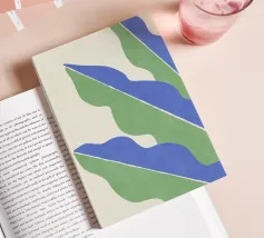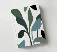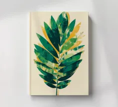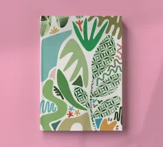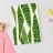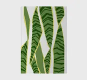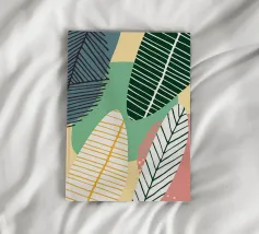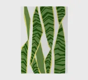 Abstract geometric patterns with green and yellow stripes create a sense of movement across the composition. The design features irregularly shaped vertical elements that suggest a natural theme.