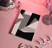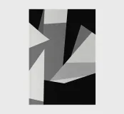 Geometric shapes in varying shades of gray, white, and black create a modern abstract composition. Sharp angles and contrasting tones enhance the dynamic feel of the design.
