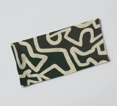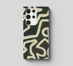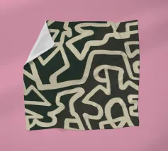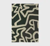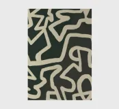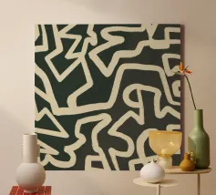 An abstract pattern of interlocking and irregular white lines creates a maze-like design on a dark background. The lines weave throughout the space without a clear beginning or end, suggesting complexity and continuous movement.