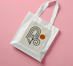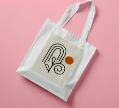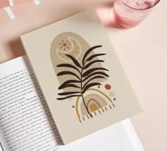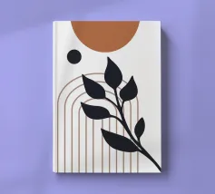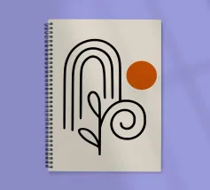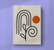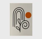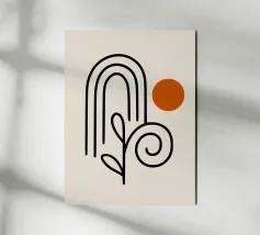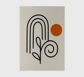 A minimalist design featuring abstract line work depicting a plant form next to a bold, red circle. The background is a neutral beige, enhancing the simplicity.