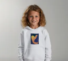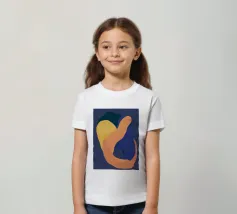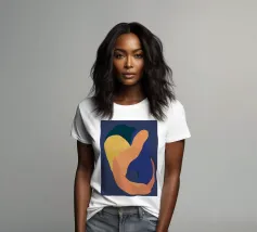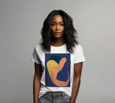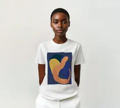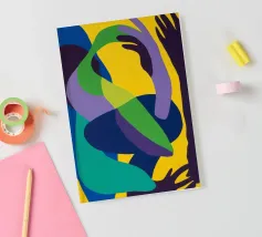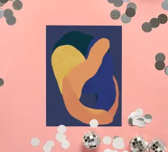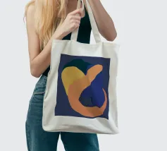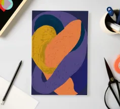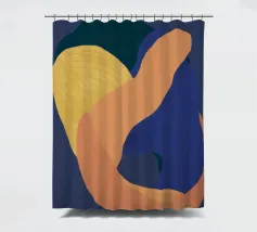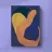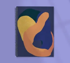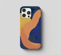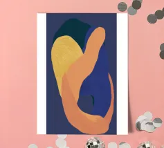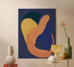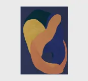 An abstract composition of overlapping, rounded shapes in yellow, orange, and deep blue, suggesting a reclining human form in a minimalist and fluid style, exploring the essence of shape and color.