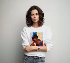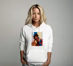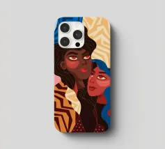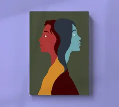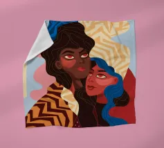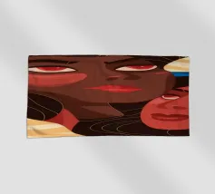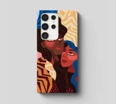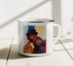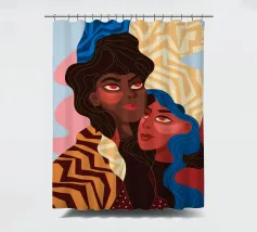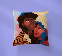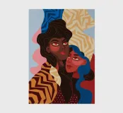 This painting portrays two individuals with intertwined hair and abstract patterns in the background. The use of bold colors and geometric shapes creates a sense of unity and fusion.