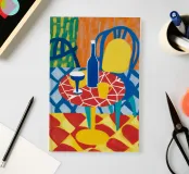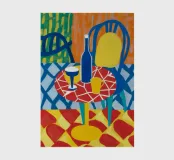 A highly stylized and abstract still life featuring a beverage in a wicker wrapped glass with a blue straw. The scene is set on a surface with bold red and yellow patterns, against a textured green background.