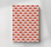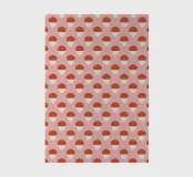 A repeating pattern features red and white geometric shapes on a soft pink background. Each shape resembles a half-circle stacked on a trapezoid, creating a cohesive and rhythmic design.