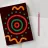 A bold, abstract design features concentric circles in red and green, surrounded by green dots. Two wavy orange lines add dynamic movement to the composition.